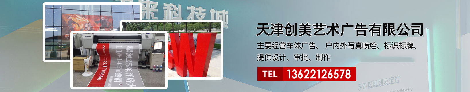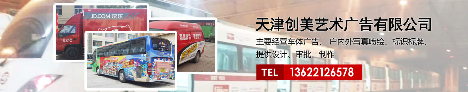 天津創(chuàng)美藝術廣告有限公司主要經營車體廣告、 戶內外寫真噴繪、標識標牌、提供設計、審批、制作、發(fā)布的服務。